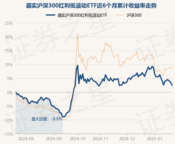 本站消息,1月22日,嘉实沪深300红利低波动ETF最新单位净值为1.3131元,累计净值为1.5794元,较前一交易日下跌0.78%。历史数据显示该基金近1个月下跌3.12%,近3个月下跌2.26%,近6个月上涨2.32%,近1年上涨21.46%。该基金近6个月的累计收益率走势如下图: